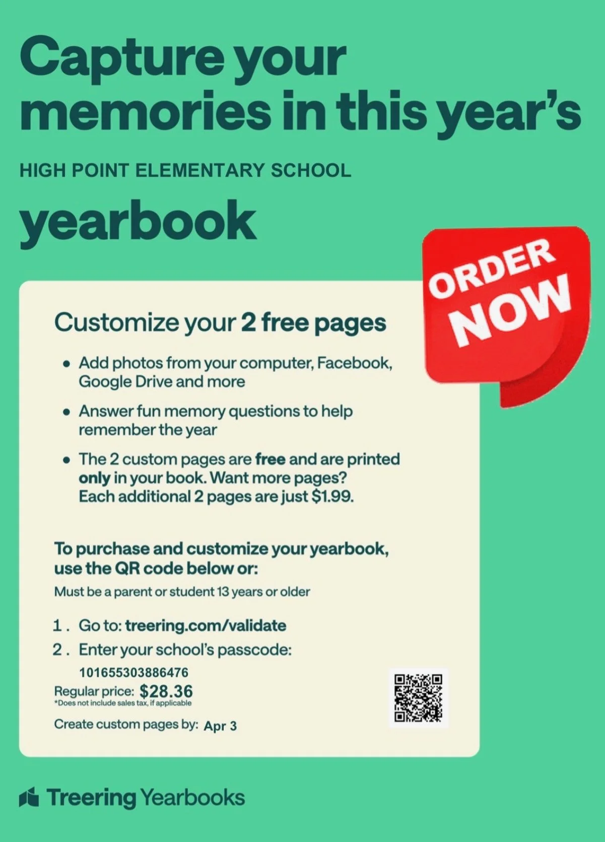 Orders must be placed by April 6th in order for your child's yearbook to be delivered to the school.
